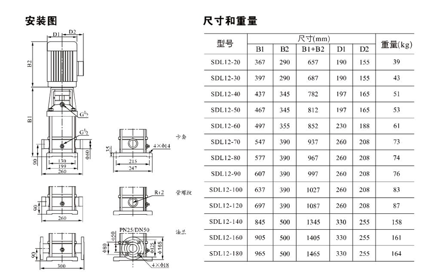 南元SDL12/SDLT12立式多級離心泵有不同的泵規格和不同級數,以滿足所需的流量和壓力。