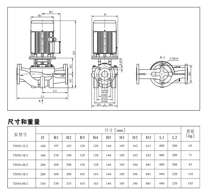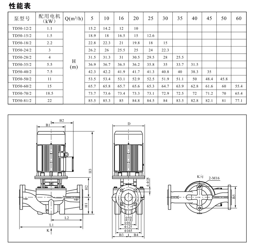 TD50系列單級管道離心泵,配有標準電 機和機械密封。此類產(chǎn)品的結構與相近類型產(chǎn)品相比,更不易受到泵送液體中雜質的影響。產(chǎn)品設計為頂部可拉出的拆裝形式,其可 以在不影響管路系統(tǒng)的情況下對泵進行維修。所有泵采用創(chuàng)新式便拆式機械密封,更好機械密封無需拆卸電機。
